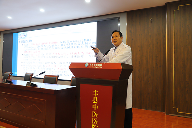 为加强医德医风建设、提升服务质量、提高患者满意度,11月1日下午,丰县中医医院组织开展医务人员医德医风专题培训讲座,由院党总支书记、副院长李永峰授课。