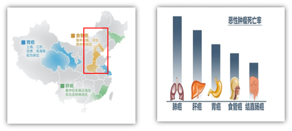 胃癌一直是我国发病率和病死率较高的恶性肿瘤之一。根据2012年中国肿瘤登记年报提示,从消化道肿瘤高发地区来看,胃癌高发于江浙沪、甘肃、青海等地区,食管癌高发于河南、河北等平原地区,而我们所在的地区正好处于两种肿瘤高发区的交汇处。在我国所有肿瘤死亡率排行榜上,胃癌第三位,食管癌第四位。